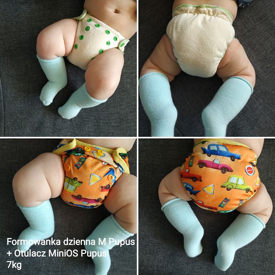 - Otulacz MiniOS z lamówką - mimo, że mam wersję zmodyfikowaną w stosunku do pierwotnej, to dalej nie jestem przekonana, ale chyba dlatego, że mało się lubię z tego typu lamówką :P Zazwyczaj takie otulacze nachodzą mi na udka i jakkolwiek w wielu pieluszkach nie sprawia mi to problemu to, jak lamówka przechodzi mi przez udko to mi to przeszkadza. Używam czasem z wkładem żółtym długim Pupus, który bardzo lubię, bo ma wg mnie idealną długość (!), czasem na tetrę czy formowankę Pupus. Zecydowanie wolę jednak otulacz OS ;)