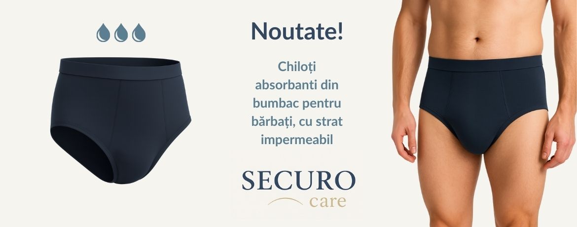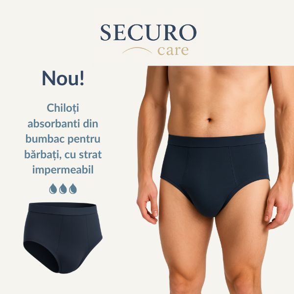 Chiloții absorbanți Securo sunt o soluție discretă pentru bărbații care se confruntă cu incontinență urinară ușoară sau moderată. Arată ca lenjeria clasică, dar în același timp protejează eficient împotriva umezelii și a mirosurilor neplăcute. Sunt recomandați după operații de prostată, în caz de hipertrofie de prostată, afecțiuni neurologice sau slăbirea mușchilor planșeului pelvin.