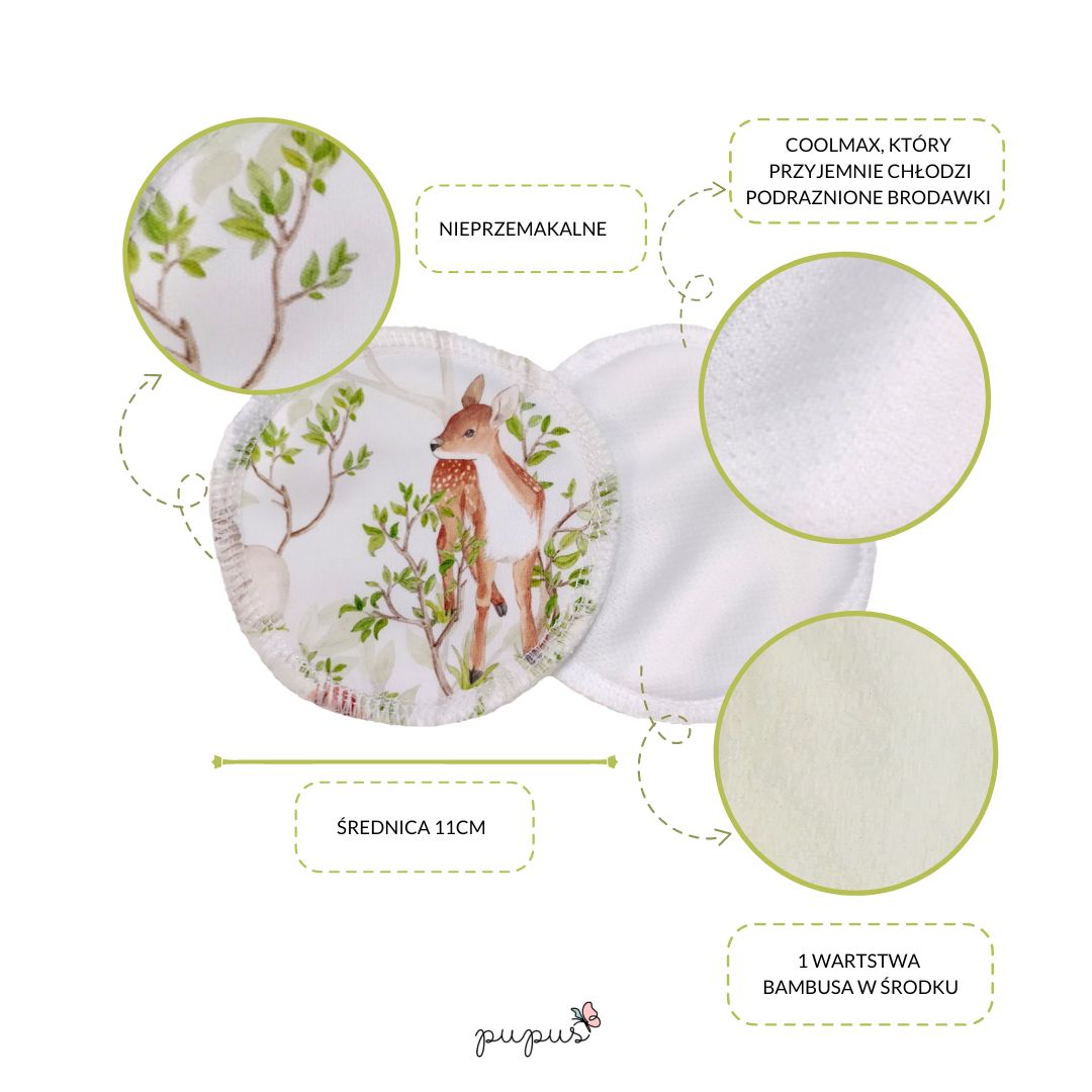 Uszyte w Polsce (w Olsztynie:) wielorazowe wkładki laktacyjne z bardzo chłonnym bambusem oraz delikatnym, chłodzącym podrażnione brodawki coolmaxem.