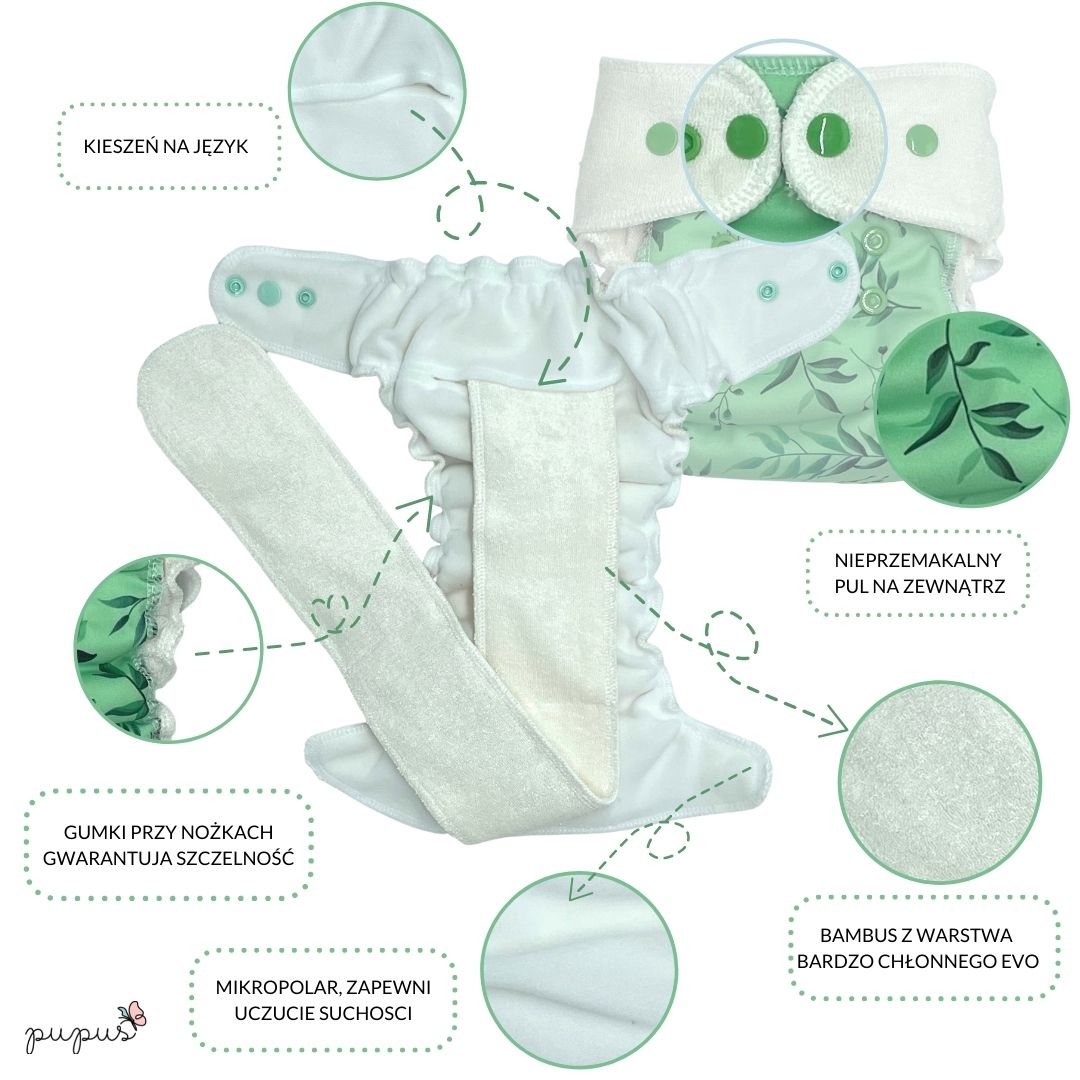 - I na końcu panel PUL na zewnętrznej stronie, który dodatkowo wzmocni szczelność pieluszki