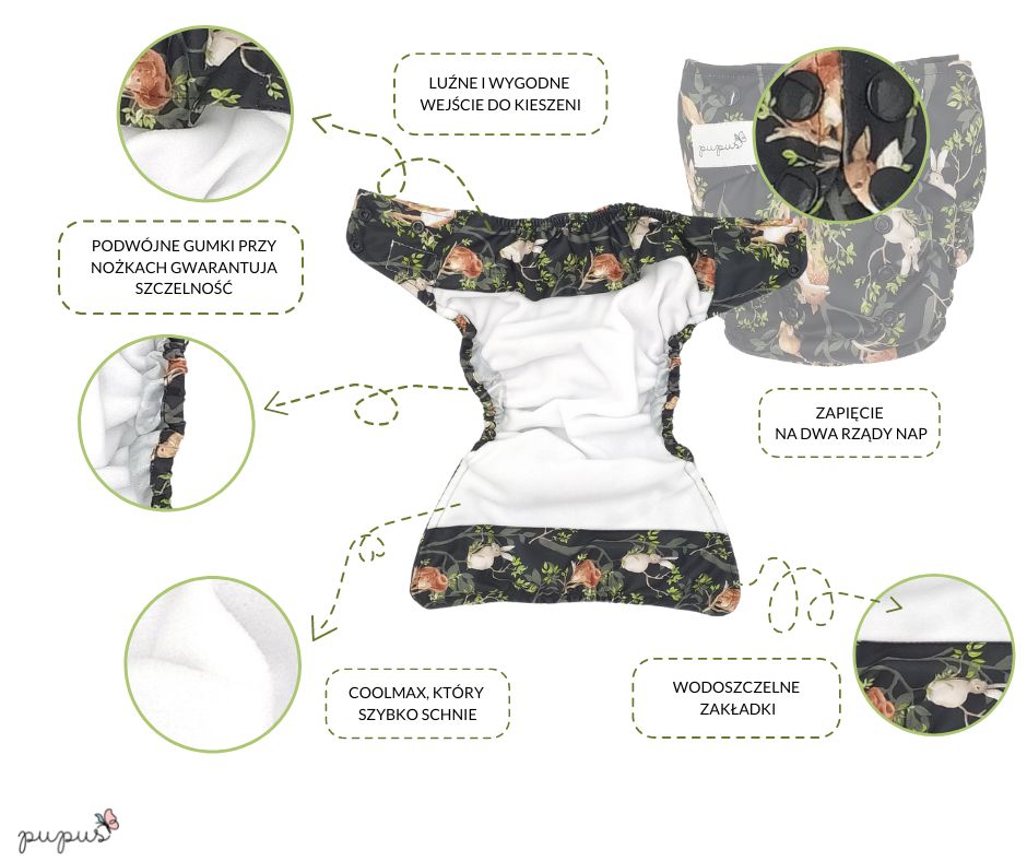 Pieluszki pasują na dzieci od 5 do 15 kilogramów. Ich rozmiar można regulować za pomocą napów z przodu pieluszki. Do środka, do kieszonki, możesz włożyć każdą naszą wkładkę, (oprócz wkładek XL, które są przeznaczone do dużych pieluszek). Jeśli nie wiesz, jaką wkładkę wybrać, przeczytaj ten artykuł.
