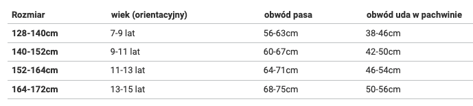 Rozmiar | wiek (orientacyjny) | obwód pasa | obwód uda w pachwinie |